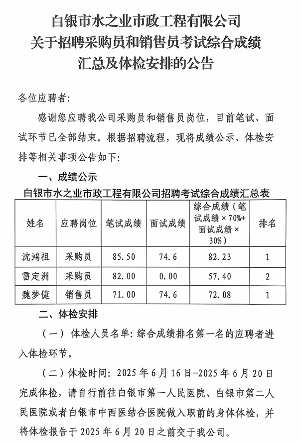 白銀市水之業(yè)市政工程有限公司關(guān)于招聘采購(gòu)員和銷(xiāo)售員考試綜合成績(jī)匯總及體檢安排的公告