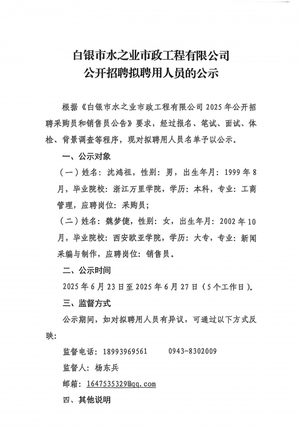 白銀市水之業(yè)市政工程有限公司公開招聘擬聘用人員的公示
